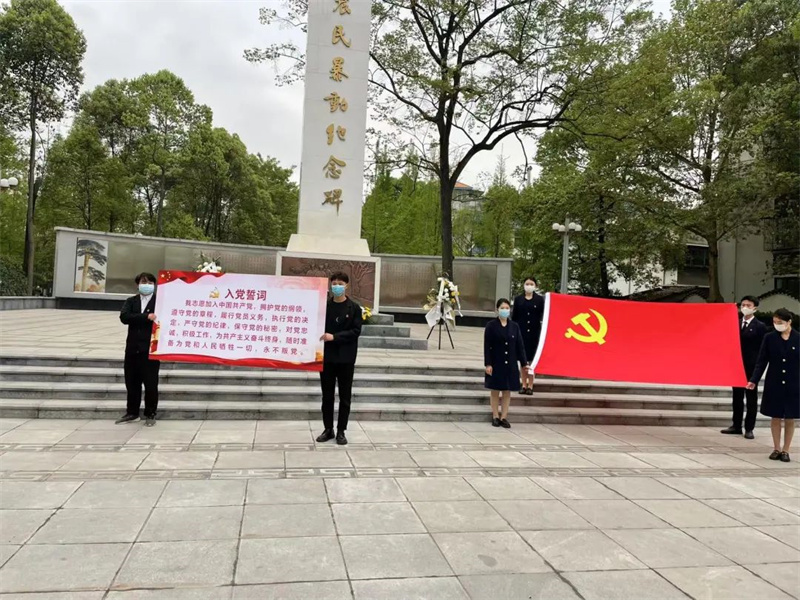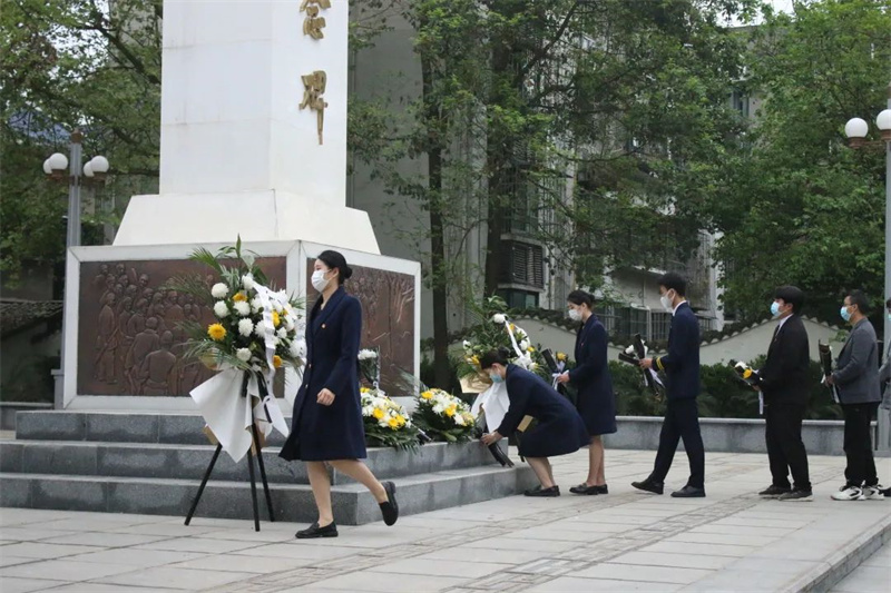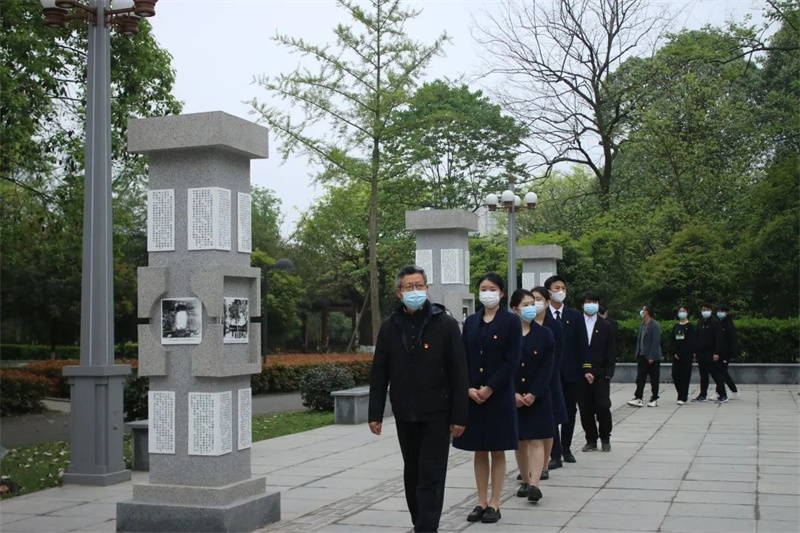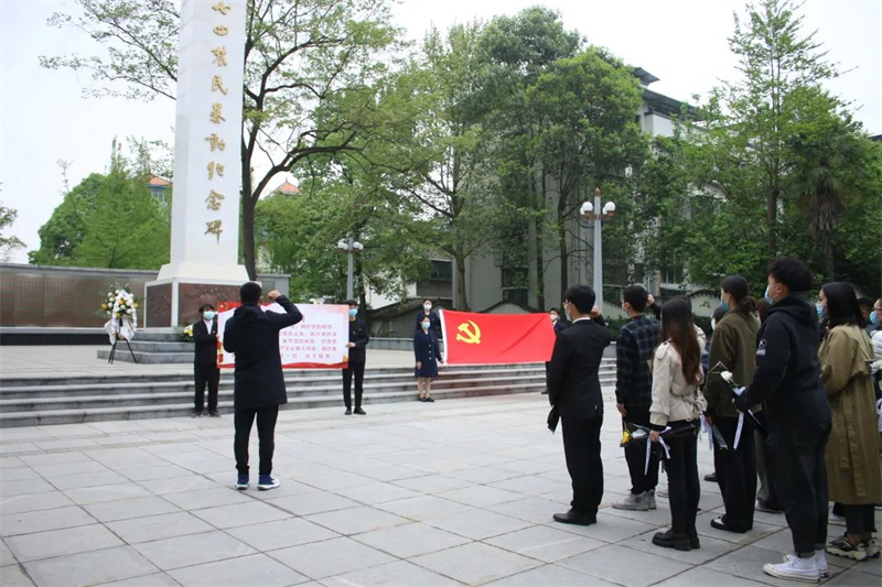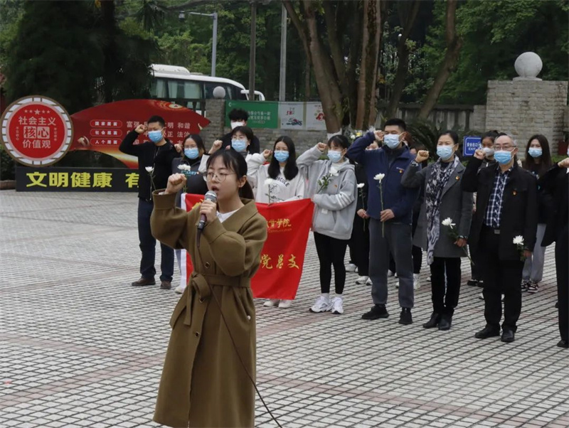 两校区党员分别来到崇州市烈士陵园、绵竹市人民公园农民暴动纪念碑前举行仪式。随着《中华人民共和国国歌》响起,铿锵的音符带领着大家在历史的尘土中寻觅英勇先烈的丰功伟绩。全体人员怀着崇敬之心,在庄严肃穆的氛围之中,追忆革命烈士抛头颅洒热血的英勇事迹。