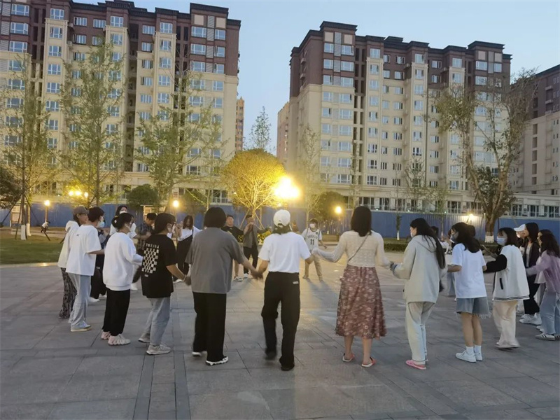 学生处心理咨询中心和学生处学生干部组织学生在二校区操场和三校区5栋和6栋中间开展跳锅庄解压活动。