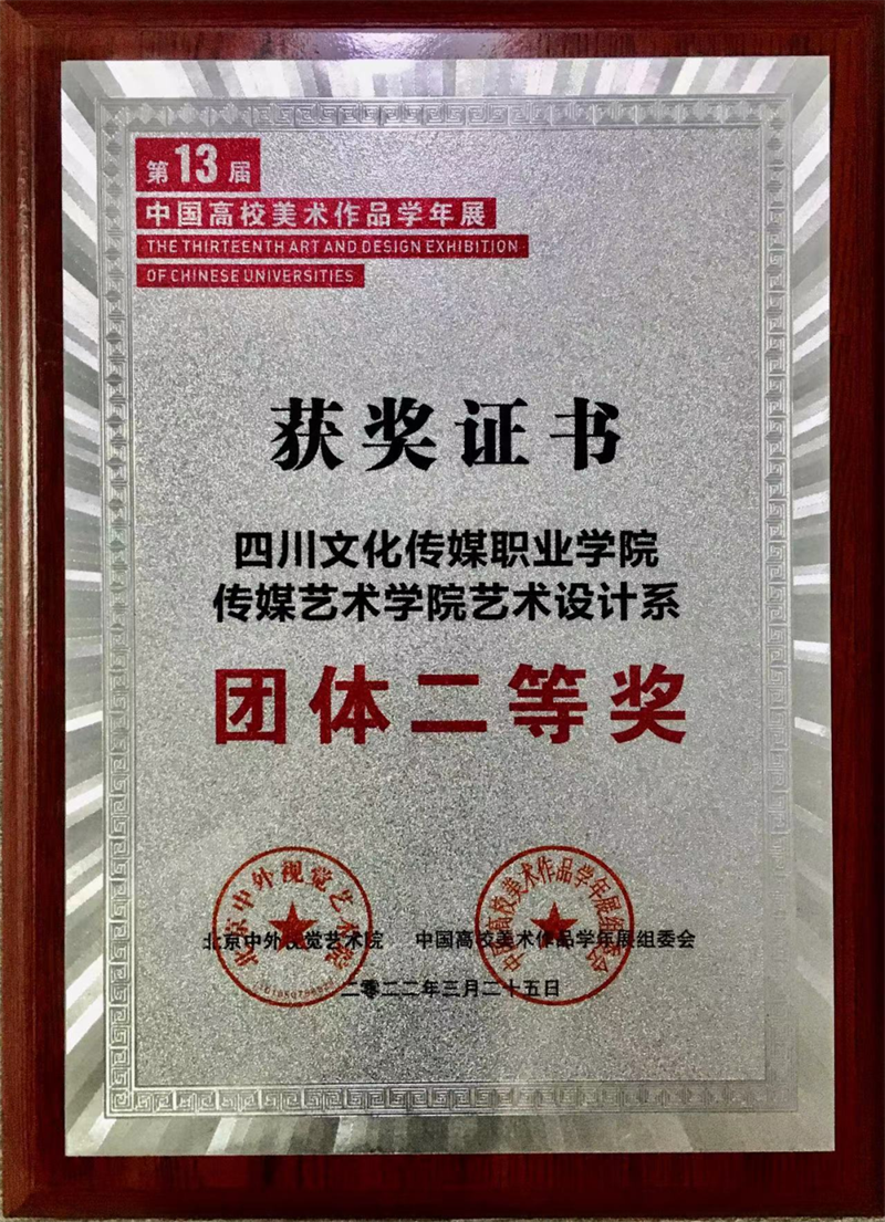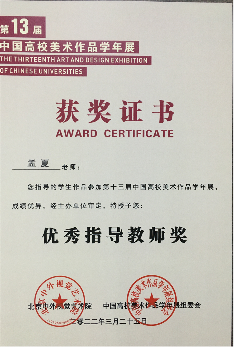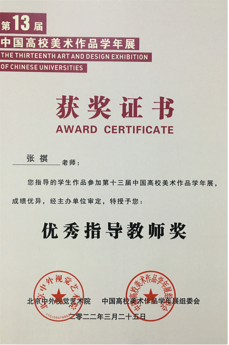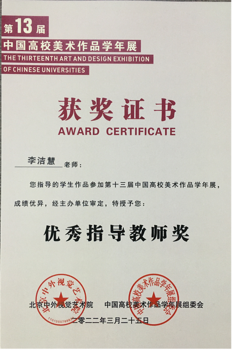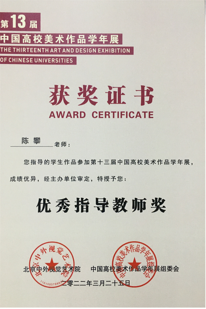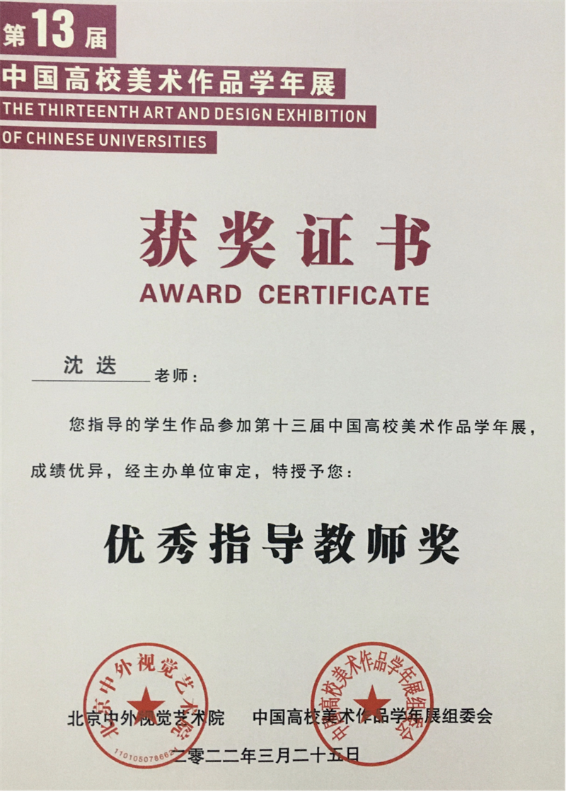 2022年4月,由中国高校美术作品学年展组委会、北京中外视觉艺术院主办,中外美术研究院、中外设计研究院联办,成都蓉城美术馆承办的大型年度艺术活动——第十三届中国高校美术作品学年展获奖名单公布。