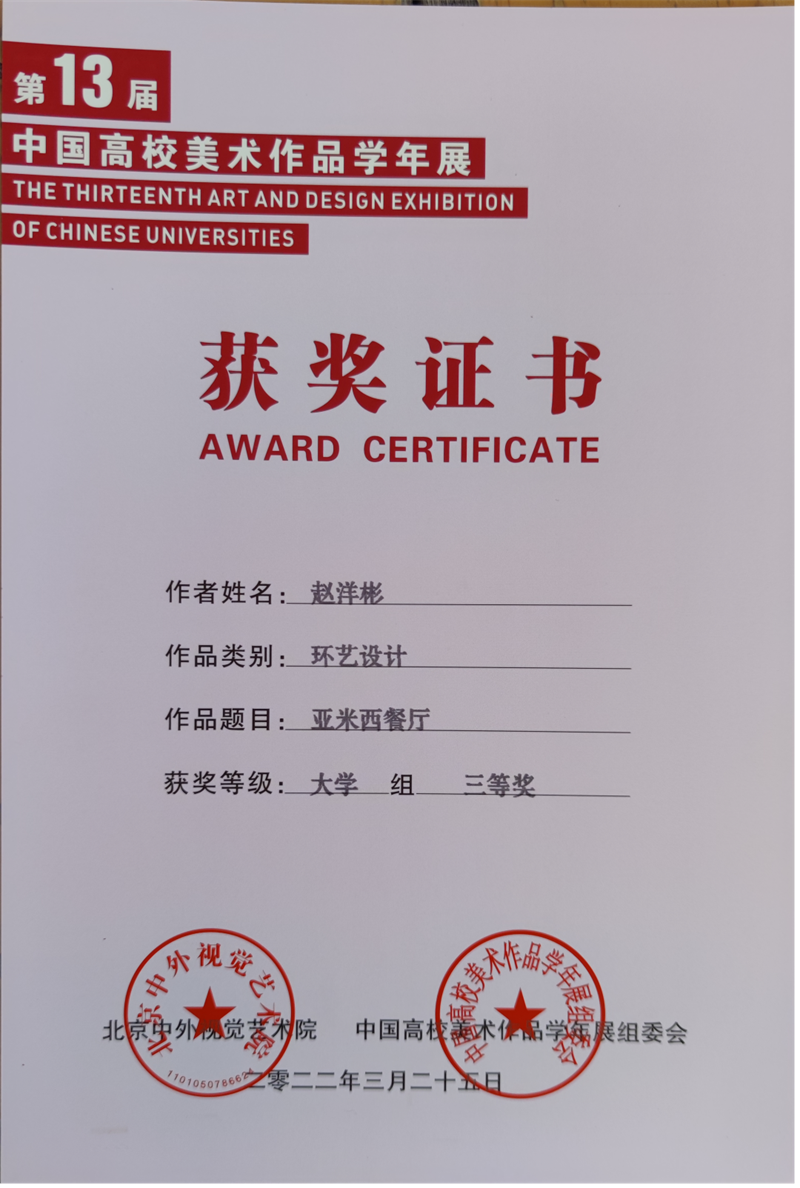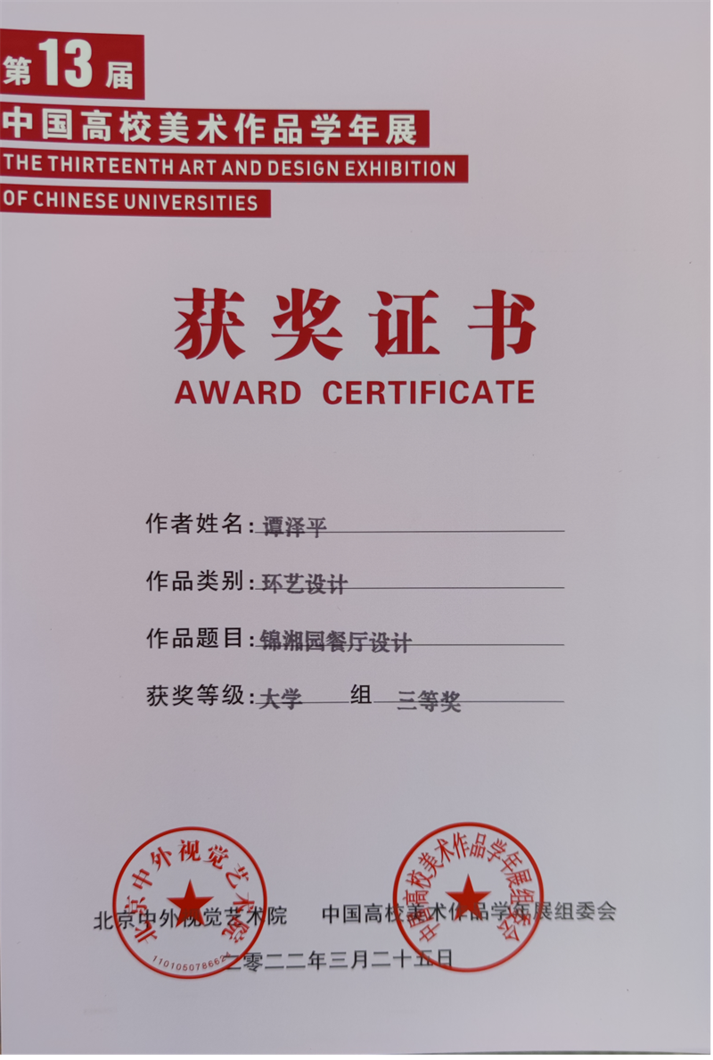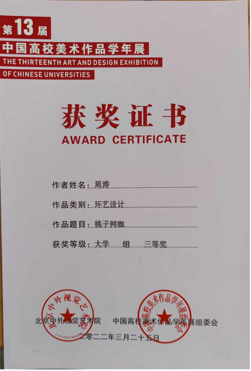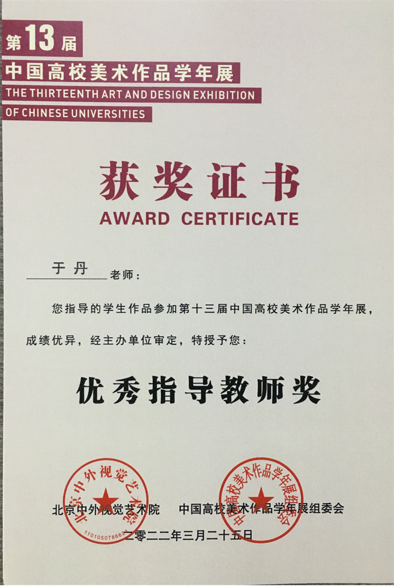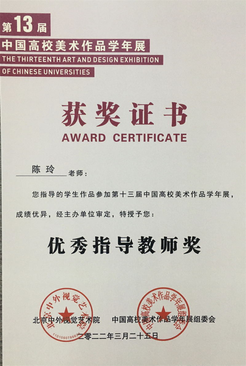 2022年4月,由中国高校美术作品学年展组委会、北京中外视觉艺术院主办,中外美术研究院、中外设计研究院联办,成都蓉城美术馆承办的大型年度艺术活动——第十三届中国高校美术作品学年展获奖名单公布。