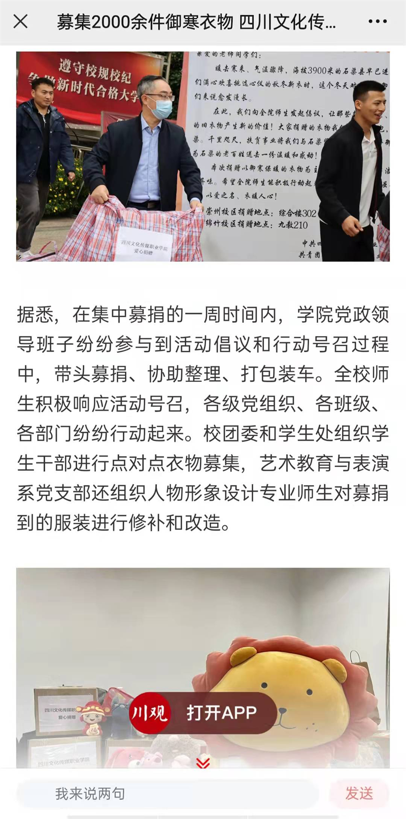 川观新闻对人物形象设计专业“大衣改小衣”爱心活动进行报道。