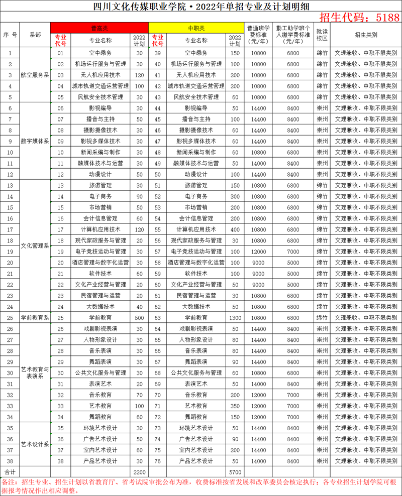 三、四川文化传媒职业学院2022年38个单招专业及收费