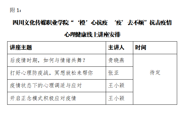 面向全校师生举办以“‘橙’心抗疫 ‘疫’去不烦”为主题的线上心理健康讲座及活动。举行心理辅导员工作会议和心理危机干预培训,提高相关人员开展疫情封控期间心理防护和危机干预的专业技能。