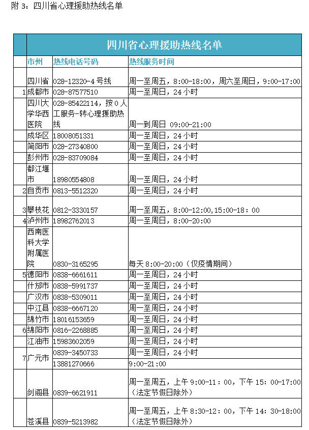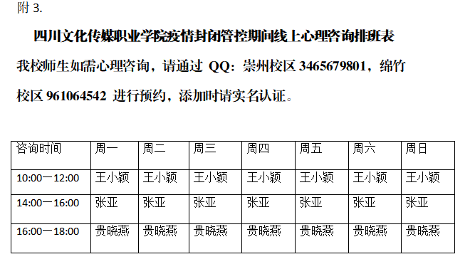 依托“四川省心理援助平台”,充分积极发挥我校大学生心理健康教育与咨询中心作用,保证咨询不断线。通过 QQ 号:崇州校区3465679801,绵竹校区961064542为全校师生提供抗疫情绪疏导和心理支持服务。