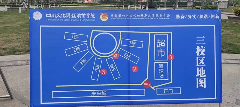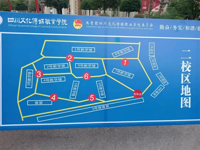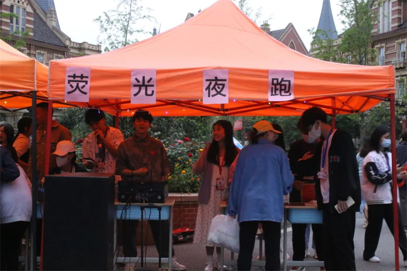 本次荧光夜跑采用环校跑的形式,分别在二校区、三校区内同时展开,二校区线路是从七号教学楼出发途径八号教学楼、三号教学楼、食堂、六号教学楼等六个地点,三校区线路则是从篮球场出发依次途径学生公寓七栋、学生公寓五栋等五个地点。