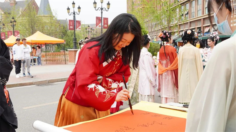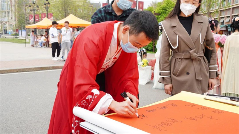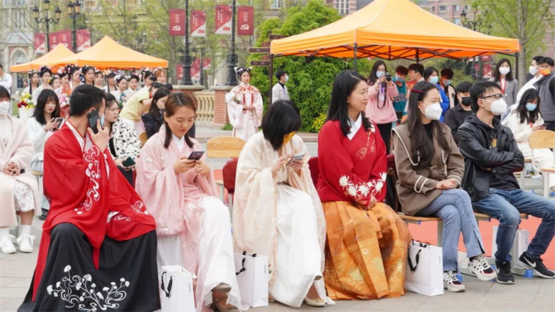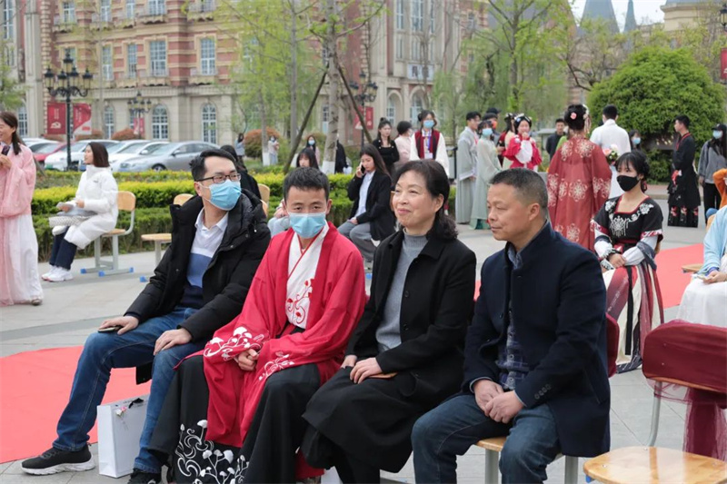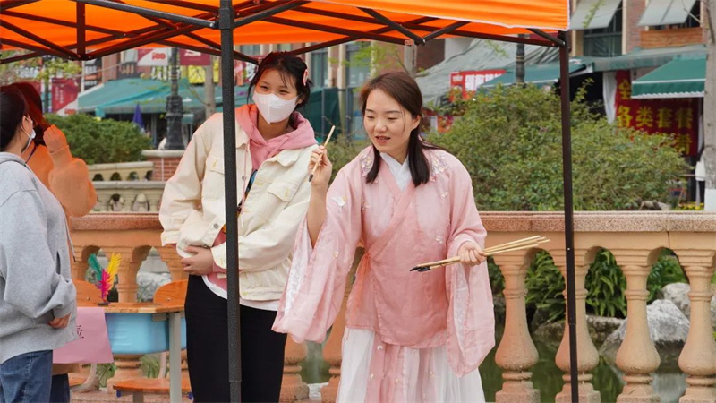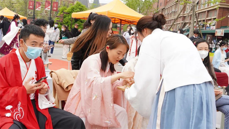 伴随着优美灵动的花神舞表演,学院领导和老师们也纷纷换上精心挑选的汉服参与其中,大家共同写下祈福丝带系上树梢,祈求新的一年国泰民安、风调雨顺。现场除了有祭祀花神、巡游、赏花、古风舞蹈表演、投壶、飞花令签到等传统节俗活动,还有五子棋、流行音乐演唱等丰富多彩的现代娱乐活动。从传统到现代,从舞蹈到器乐,真正让这个花朝节呈现出“百花齐放”的态势。
