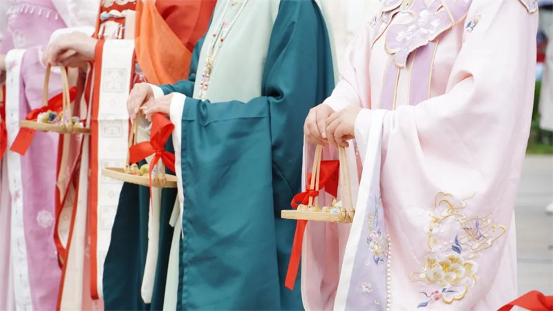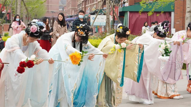 花朝节,在古代也叫花神节。“百花生日是良辰,未到花朝一半春。红紫万千披锦绣,尚劳点缀贺花神。”清朝诗人蔡云这首诗,描述的正是花朝日盛况。在活动现场,身着华美汉服的文传“十二花神”惊艳亮相,她们带来的《花神舞》表演以柔美优雅的舞姿配合悠然委婉的古风歌曲,让现场观众身临其境,犹如置身于一副水墨画卷中。