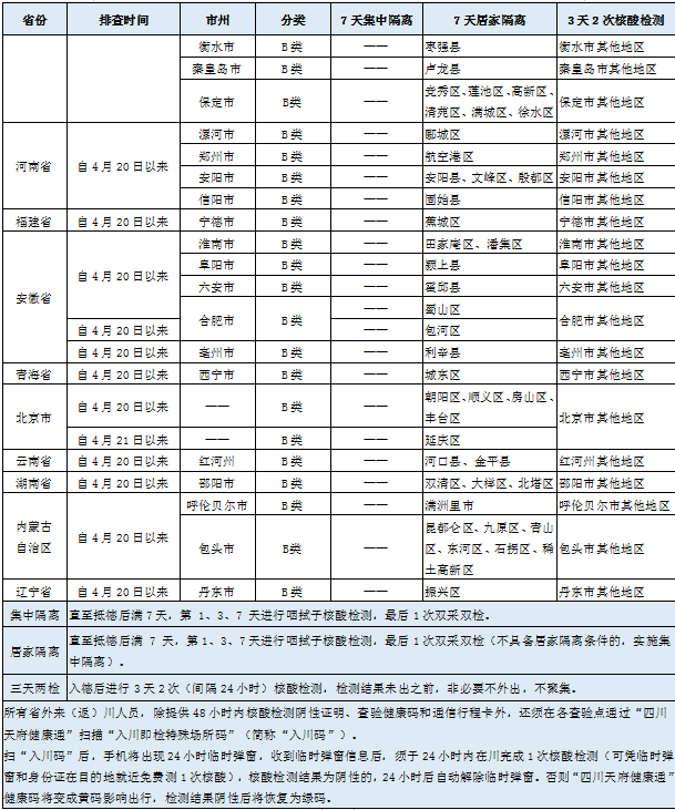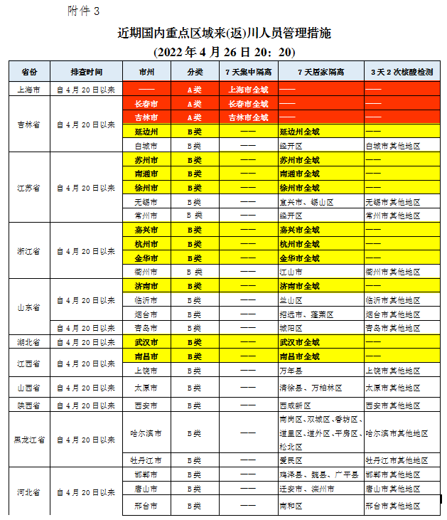 近期国内重点区域来(返)川人员管理措施