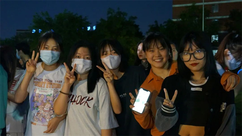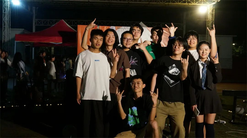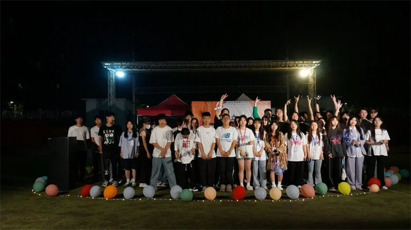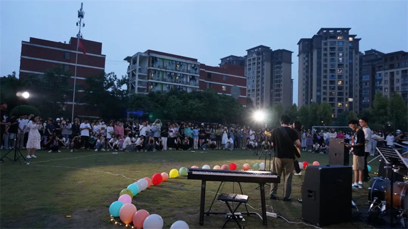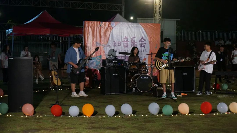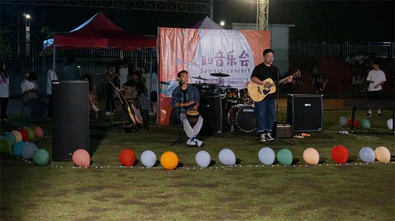 夜幕降临,晚风渐起,草地与音乐作伴,灯光以人群为邻,五颜六色的气球引人注目,幕布上的“夏日音乐会”也格外显眼。绿茵场上少了奔跑的身影,多了席地而坐的人群,同学们挥舞着荧光棒,身体随意摇摆,耐心等待音乐会的开幕。