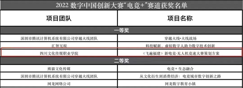 今年4月,谯山又带队参赛2022数字中国创新大赛“电竞+”赛道总决赛,以《飞遍福建——新电竞·无人机竞速大赛策划方案》从全国672支队伍中脱颖而出,荣获一等奖!返校后,谯山与学生们召开赛后总结研讨会。他很欣喜地听到参赛学生们感受到了新职业的市场要求、更深入地理解了电竞产业中的新动向,“通过比赛多看、多听、多学,真正感受到触动,这比我们在课堂上碎碎念十遍都有效果”,一点一滴的努力终有结果,一次次的比赛成绩也让行业内更多人知道,文传学院的电竞战队实力不可小觑。