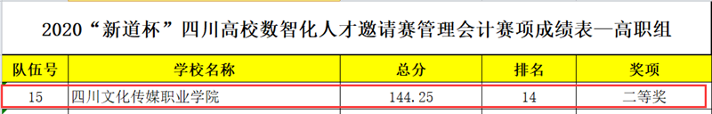 4月11日,由新道科技股份有限公司主办的2020“新道杯”四川高校数智化人才邀请赛之管理会计网赛在线上顺利开展。本次大赛的举办是为了检验和展示高校财会类专业教学改革成果和学生会计职业岗位通用技术、职业能力以及职业素养,引领和促进高职院校财会类专业教学改革,激发和调动行业企业关注和参与财会类专业教学改革的主动性和积极性,推动提升高校财经类专业人才培养水平。学院18级方进鑫、温盈盈、周晓清、庄宗璠四名学子,在文化管理系会计专业老师董婷婷和金珂羽的带领下组成代表队参赛,在疫情带来的环境和网络的影响下,师生共同努力克服困难、互相配合、团结协作,最终以144.25的总分取得二等奖的优异成绩,为学院争光。