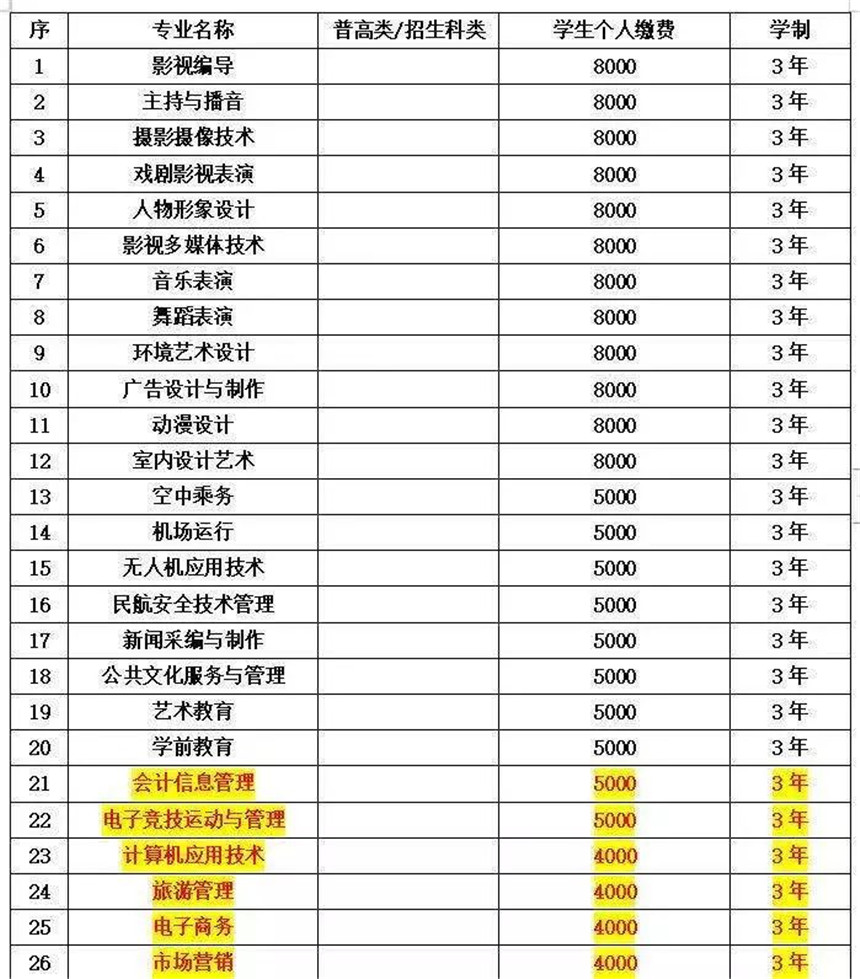 3、招生专业:影视编导、主持与播音、摄影摄像技术、戏剧影视表演、人物形象设计、影视多媒体技术、音乐表演、舞蹈表演、环境艺术设计、广告设计与制作、动漫设计、室内设计艺术、空中乘务、机场运行、无人机应用技术、民航安全技术管理、新闻采编与制作、公共文化服务与管理、艺术教育、学前教育、旅游管理、电子商务、市场营销、会计信息管理、计算机应用技术、电子竞技运动与管理。