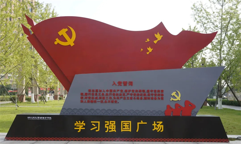 近日,四川文化传媒职业学院在绵竹校区举行学习强国广场揭幕仪式,学院党委书记周世伟主持仪式。“学习强国”主题广场的正式落成,与党史文化“网红”走廊共同形成我院的“红色地标”。