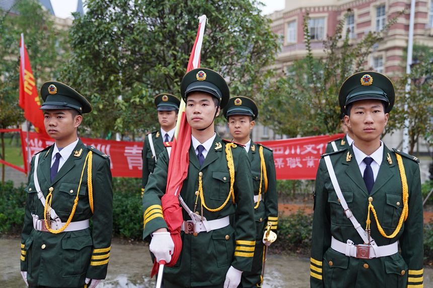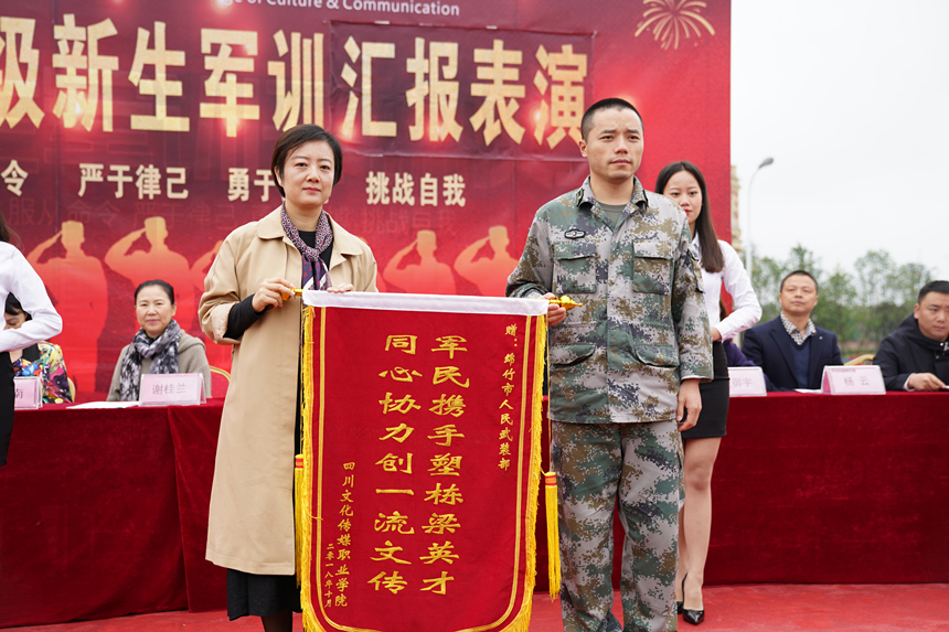 最后,执行院长罗琴向绵竹市武装部赠送锦旗,感谢他们为本次军训做出的努力与贡献。