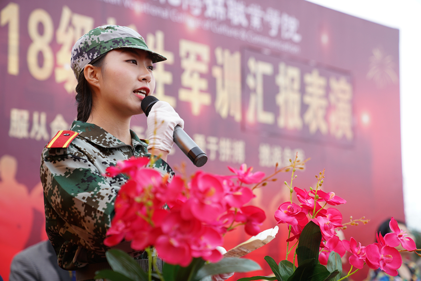 随后,谢桂兰书记在汇演中讲话。她首先向不辞辛劳帮助我们完成军训任务的各位教官表示衷心感谢。随后,她对同学们提出了殷切的希望——她希望萌新们牢记这段青春时光,将军训时的优良品质保持下去。踏实努力、发奋拼搏,用激情和汗水书写无悔的青春!