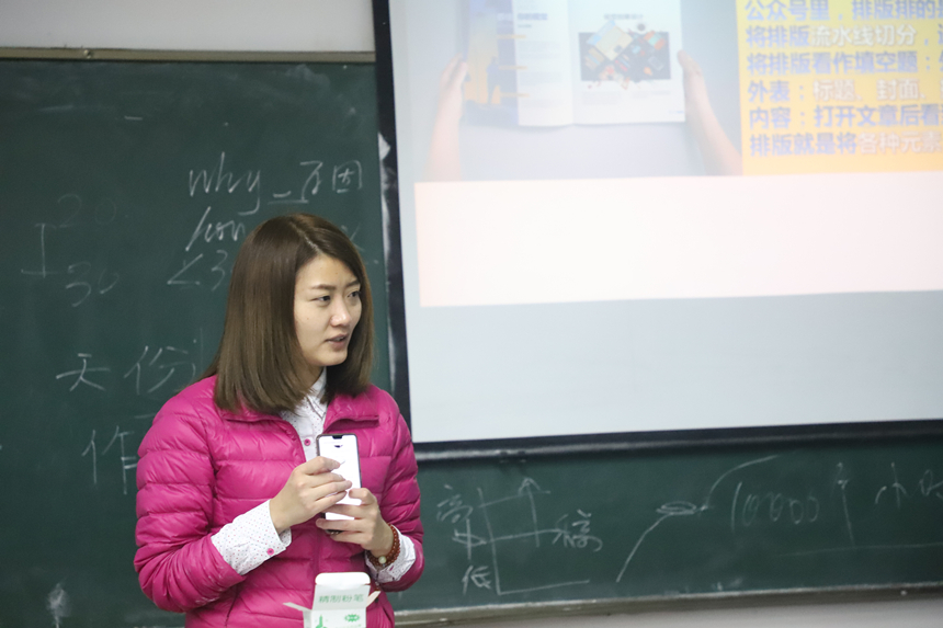 王老师由新媒体内容生产、新媒体文稿特点、新媒体视觉排版三个点切入正题,以去年期末考试“送命题”为例,阐述各大网络平台的传播速度似网状广泛散播,也说明了各大媒体所报道新闻的特点和侧重点是各不相同的。