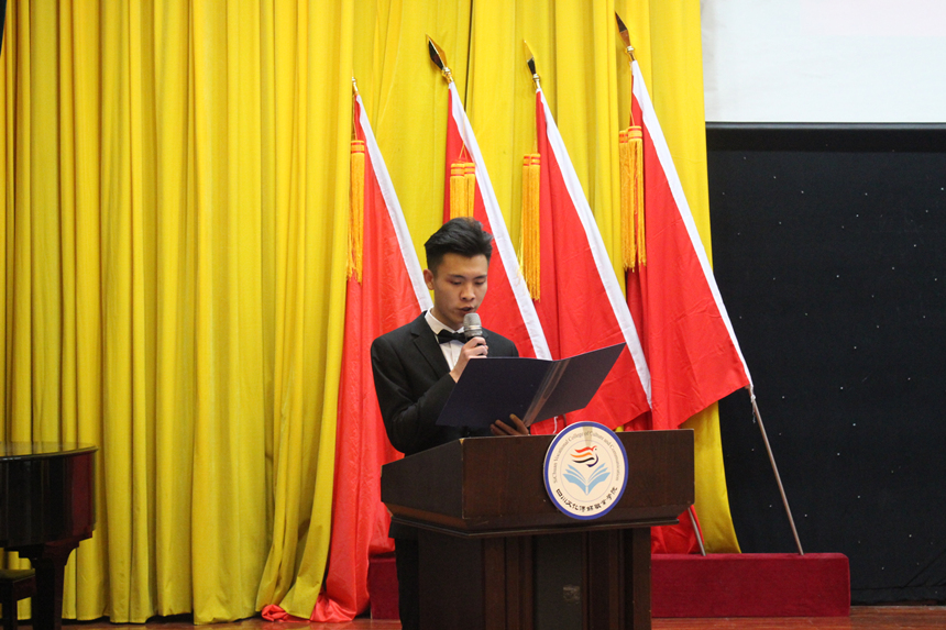 典礼伊始,主持人一一介绍了参加典礼的领导和老师。介绍完毕,全体成员一并起立,奏唱国际歌。随后,学生代表张柠发言,倡议当代大学生坚决贯彻党的路线、方针、政策,积极向党组织靠拢,在学习和生活中,以身边优秀的党员为榜样,用一个共产党员的标准来要求和鞭策自己。