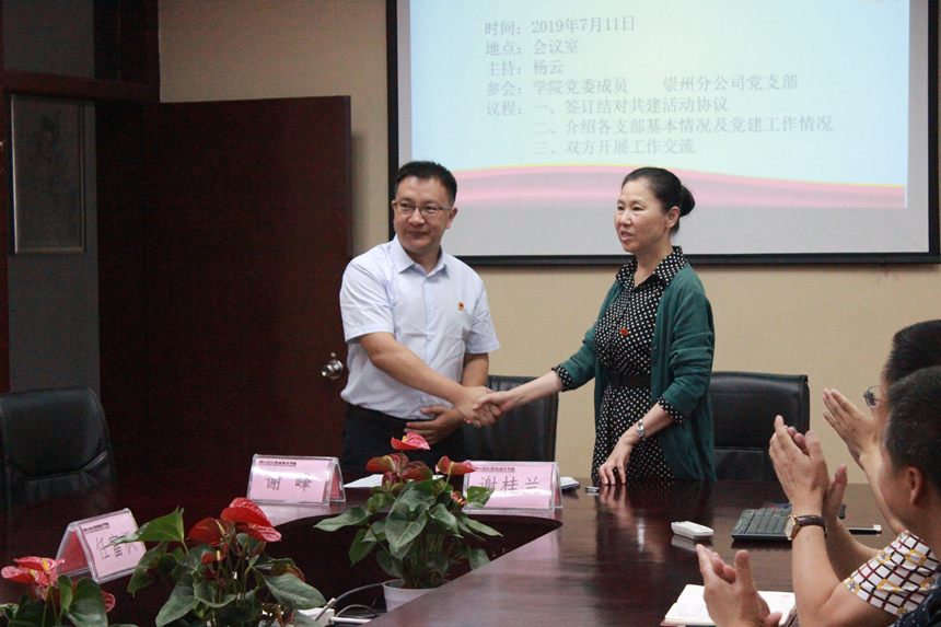 会上,崇州移动分公司党支部书记谢峰与学院党委书记谢桂兰共同签署了“党建和创”活动协议书。协议通过理论同学、组织同建、品牌同筑、服务同行、成效同享等措施,深入贯彻落实党的十九大和十九届二中、三中全会精神,以习近平新时代中国特色社会主义思想为引领,进一步探索创新党建工作,形成互带互动、优势互补、资源共享、共同发展的基层党建工作新格局,提升党组织的战斗力。