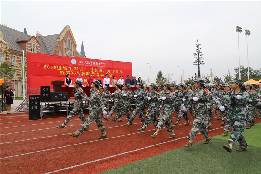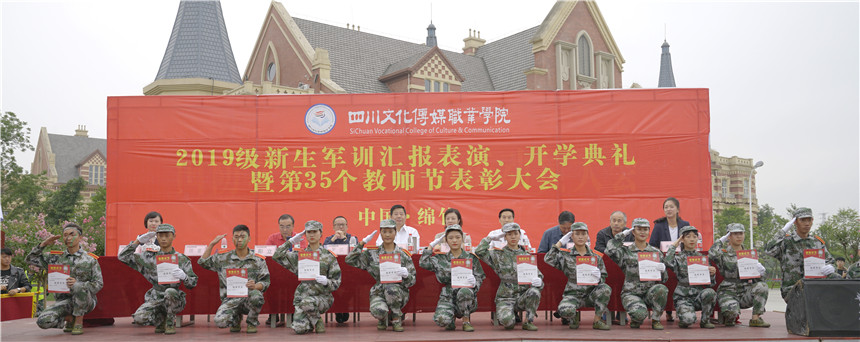 9月6日,四川文化传媒职业学院绵竹校区2019级新生军训汇报表演、开学典礼暨第35个教师节表彰大会在足球场隆重举行。希望教育产业集团教管委副主任孟兆怀、副主任毛克强,学院院长杨宁,执行院长罗琴,副院长彭立、副院长罗江,院长助理陈雷出席仪式,学前教育系主任郑国庆、文化管理系主任段御宇、航空系副主任燕珊珊以及绵竹校区全体教师辅导员和19级新生参加。此次仪式由学院院长助理陈雷主持。