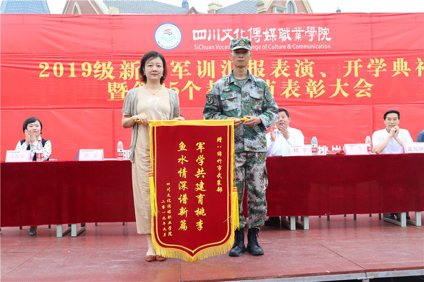执行院长罗琴向绵竹市人民武装部赠送锦旗,对绵竹市人民武装部教官军训期间辛勤的付出表示感谢。