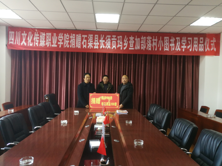 根据四川省委办公厅、省政府办公厅关于《开展学习贯彻主席来川视察重要讲话精神督导工作方案》、四川省脱贫攻坚领导小组办公室和省脱贫攻坚领导小组要求,为切实做好赴石渠县脱贫攻坚全覆盖督导工作,四川文化传媒职业学院党委委员兼第二党总支书记陈雷、五专部学管科科长陈文渊老师,于近日出发走进甘孜藏族自治州石渠县举行图书及学习用品捐赠仪式,助力当地精准扶贫。