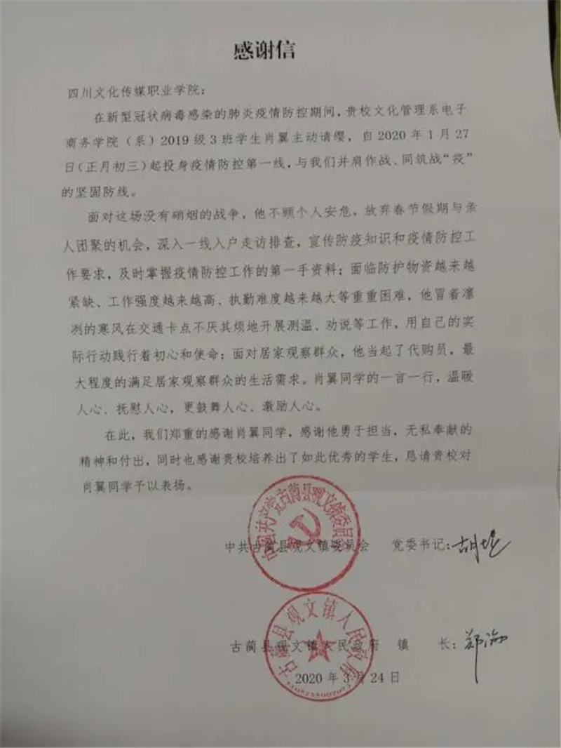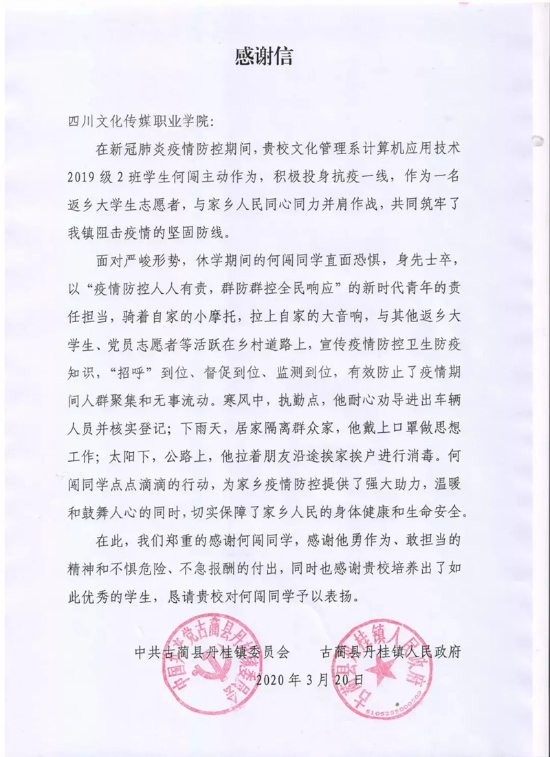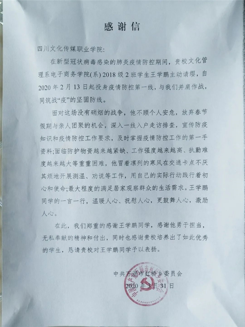 2019年9月,我完成了从空降兵部队战士向地方青年学子的角色转变,再一次成为了四川文化传媒职业学院中的一员。五个月后,国家有难,我虽不能去前线,却也愿用我的满腔热忱为祖国尽微薄之力,保卫祖国人民安全。当我身着军装时,我便时刻准备上战场;当我脱下军装时,也依然是保家卫国的子弟兵。我生活的家园由我来守护,所以我选择第一时间来到乡政府报到,做一名社区志愿者,我要用实际行动让身边的人多一份安心,要用实际行动来践行军旗下“若有战,召必回”的铮铮誓言,更要用实际行动来响应党“疫情就是命令,防控就是责任”的号召!