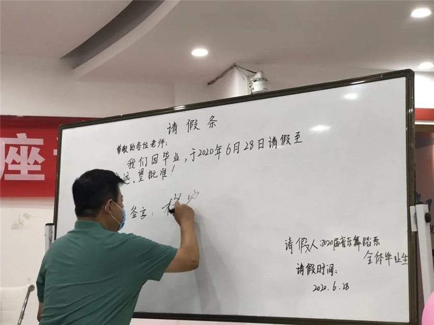 同学们在早准备好的“请假条”上,写下了全体请假,学院院长杨宁亲笔签下了同意请假。深沉的字迹,不舍的情绪,未来的希望,在此刻交相辉映,熔炼成了一滴滴泪水滑落。