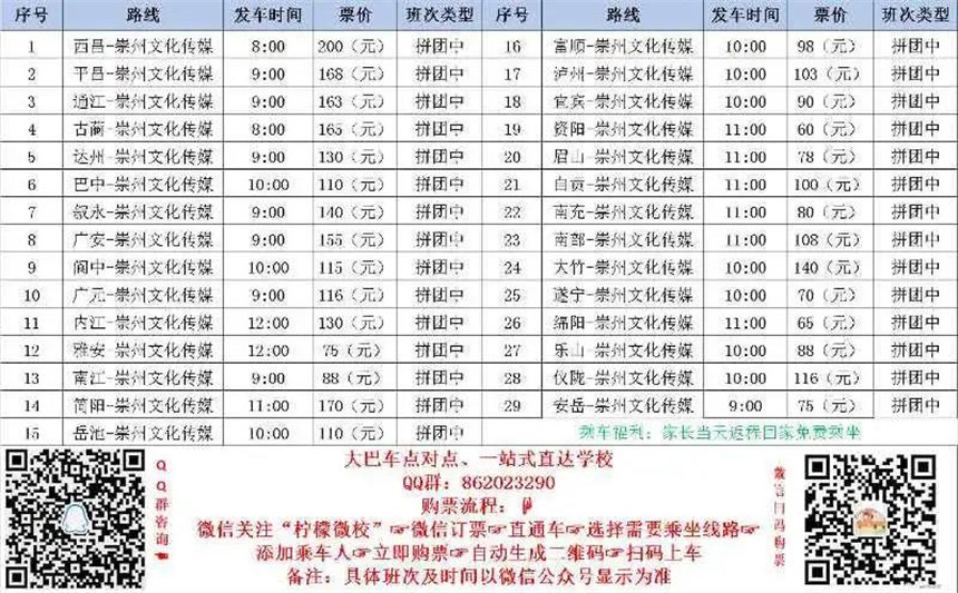 (四川文化传媒职业学院崇州校区)10月10日迎新直通车购票明细表