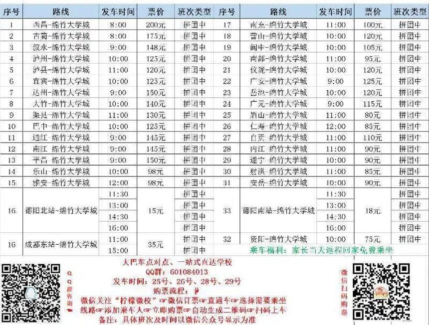 (四川文化传媒职业学院绵竹校区)10月10日迎新直通车购票明细表
