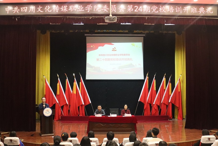 近日,中共四川文化传媒职业学院委员会党校第二十四期入党积极分子培训班开班典礼在学院小剧场隆重举行。学院党委书记、党校校长周世伟出席典礼,第二党支部书记、学生处处长蒲江江,音乐舞蹈系党支部书记、系副主任何柳,以及党校任课老师、学院相关部门工作人员、第二十四期党校培训学员代表参加。
