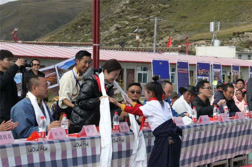 中心校学生们向远道而来的领导、嘉宾、老师献上哈达