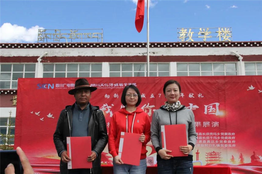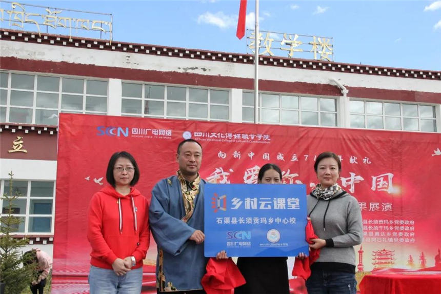 甘孜州石渠县委县委常委余庆、四川广电网络公司党委副书记曹雨真、四川文化传媒职业学院执行院长罗琴共同为长须贡玛乡中心校“乡村云课堂”揭牌。