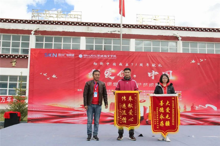 长须贡马乡中心校为表达对“乡村云课堂”教育扶贫项目两家合作单位的感谢,特意制作锦旗赠送给四川文化传媒职业学院和省广电网络公司。