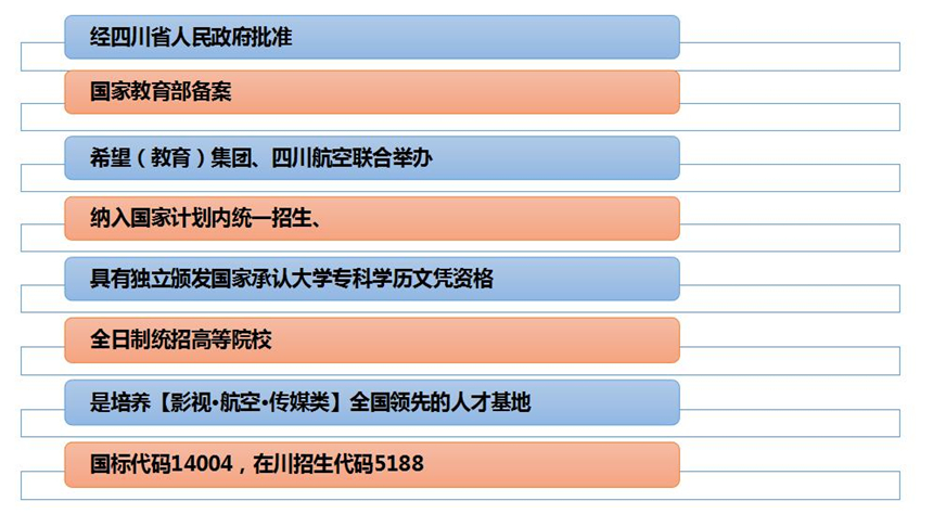 经四川省人民政府批准、国家教育部备案、希望集团、四川航空联合举办。纳入国家计划内统一招生、具有独立颁发国家承认大学专科学历文凭资格的全日制综合性普通高等院校(国标代码14004,在川招生代码:5188),是培养【影视航空传媒类】全国领先的人才基地。