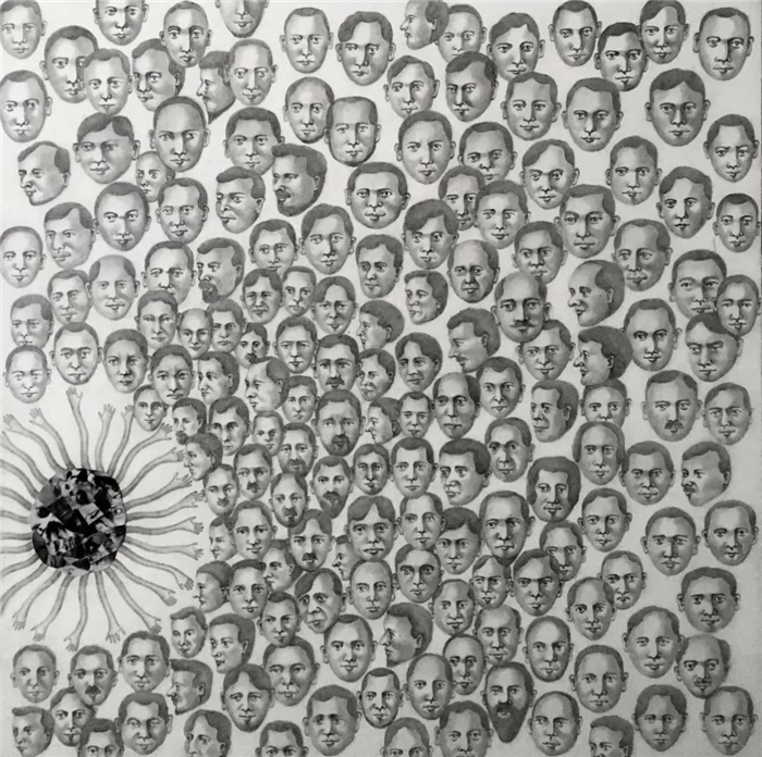 创意:这幅作品由许多不同面孔的人物头像构成,他们代表着世界公民,他们正共同包围着左下方的“新冠病毒”,这不仅是中国的战争,更是全世界的战争,我们一起众志成城,打赢这场没有硝烟的战争。
