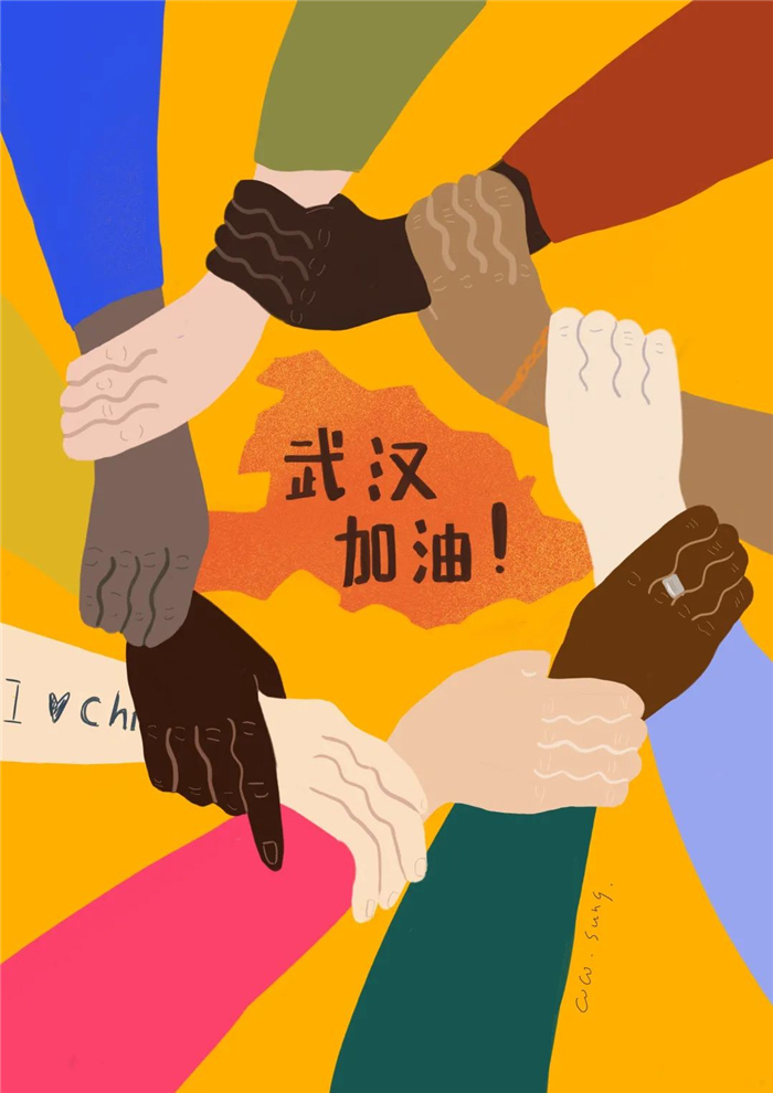 创意:作品以艳丽的色彩和富有冲击力的构图形式展现。旨在这艰难的时刻,以该作品提醒大家要相信全世界的人们都在关注中国、心系武汉,心怀希望、众志成城,便定能战胜疫情。