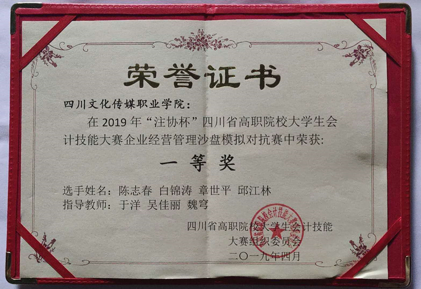 近日,四川文化传媒职业学院学生在指导老师的带领下参加了“2019年‘注协杯’四川省高职院校大学生会计技能大赛”,喜获2019年“注协杯”四川省会计技能大赛沙盘企业经营与对抗赛一等奖,接下来文传学子将代表四川省备战国赛。本次比赛在四川财经职业学院举行,来自全省44所高等职业院校的选手们参加了此次大赛。