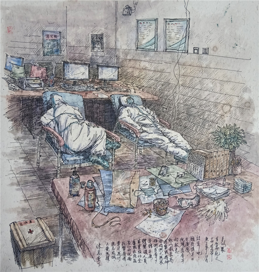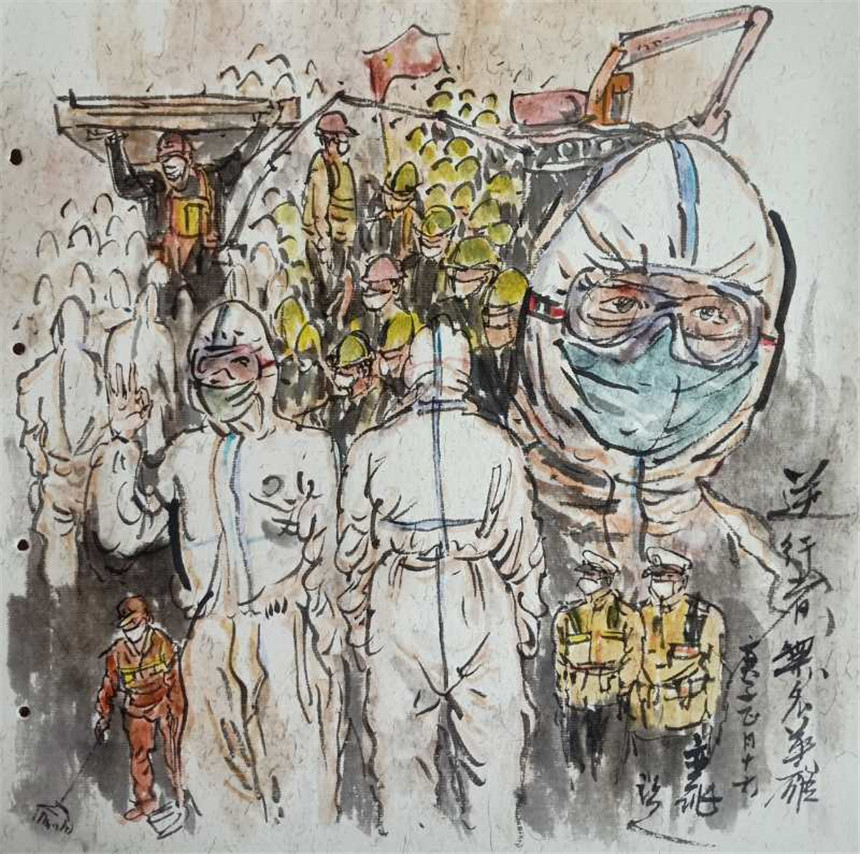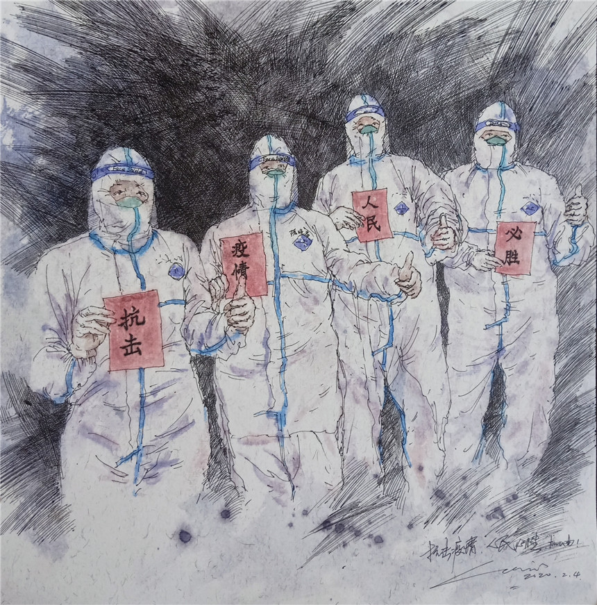 《抗击疫情,人民必胜》陆奕兆 钢笔淡彩