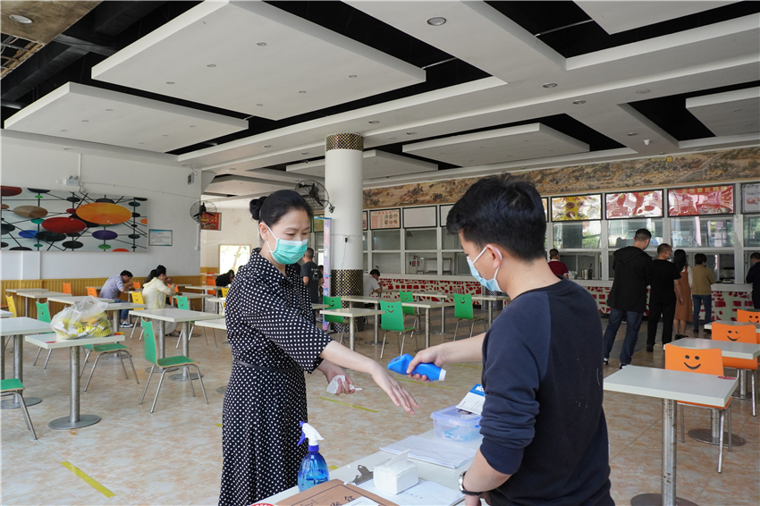 演练中,全体参演人员在食堂门口间隔一米排队,首先通过消毒区,进行体温检测,并进行手部消毒。体温低于37.3摄氏度方可进入食堂,若体温超过37.3摄氏度,由专人带至留观监测点进行研判并做出及时处置。进入食堂后,引导员引导就餐人员按照地面标示路线,进行排队取餐。餐食打包带回人员根据地面标示路线,离开食堂。堂食人员按路线到就餐区,单人单桌同向就餐。就餐完毕,将餐具放置指定回收处后,由出口离开。
