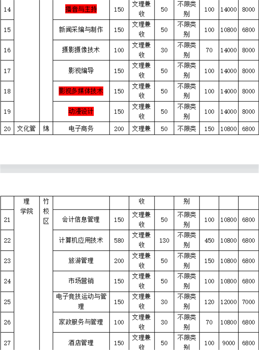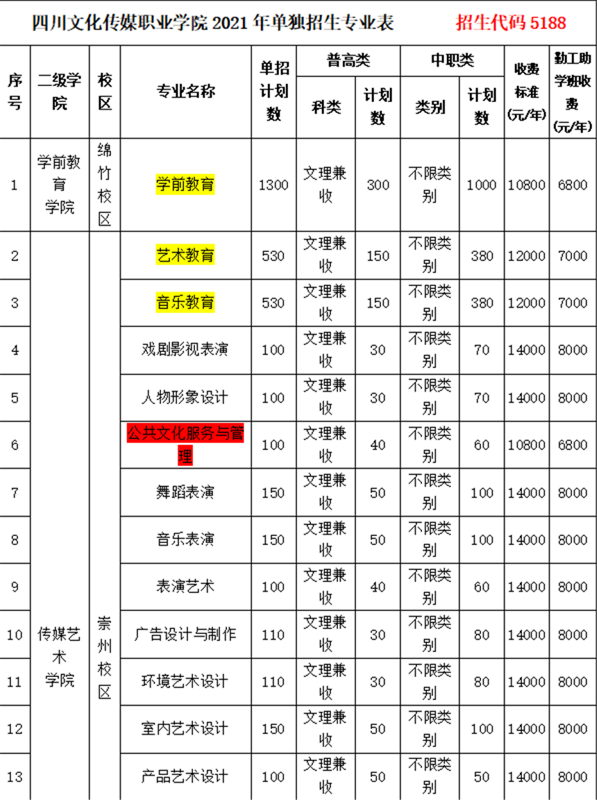 四、四川文化传媒职业学院2021年33个单招专业及收费