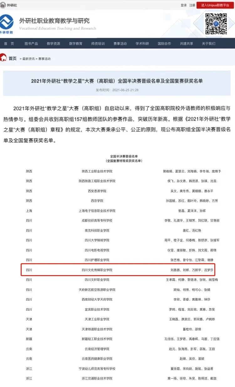 2021年6月25日外研社官方网站发布了2021年“教学之星” 大赛(高职组)全国复赛获奖名单,我校基础部英语教研室老师刘茜茜、刘娜、万新宇、吕梦莎荣获得全国复赛二等奖!