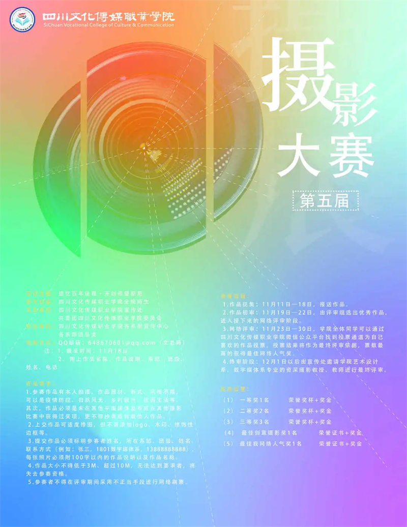 3、网络评审:11月23日—11月30日,学院全体师生可以通过四川文化传媒职业学院微信公众平台找到投票渠道,并为自己喜欢的作品投票,票数最高的获得最佳网络人气奖。