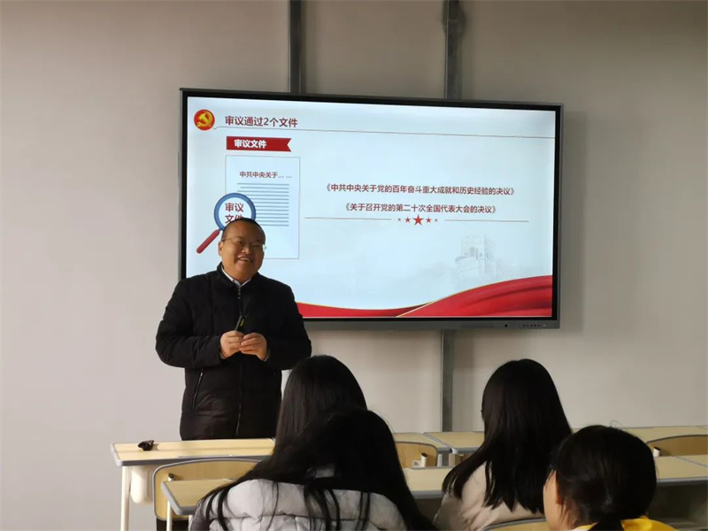 宣讲会上,刘主任从九个方面向同学们讲解十九届六中全会精神,聚焦《中国共产党第十九届中央委员会第六次全体会议公报》《中共中央关于党的百年奋斗重大成就和历史经验的决议》、习近平总书记关于《中共中央关于党的百年奋斗重大成就和历史经验的决议》的说明等重要内容展开学习,强调“两个确立”是时代呼唤、历史选择、民心所向,对新时代党和国家事业发展、对推进中华民族伟大复兴历史进程具有决定性意义。在讲到本次大会通过的决议时,刘主任带领同学们一起回顾中国共产党百年历史,分别介绍我党历史上三次决议的历史背景、决议内容及其意义。同学们听后对三个决议有了更深入、更全面的理解。在刘主任和同学们的问答中,宣讲会的气氛推向高潮。