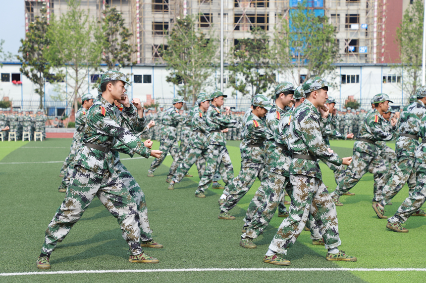 格斗式方队是最能体现一个团队的凝聚力和意志力,军训练就了同学们坚强的意志,同时也让大家在军训中了解彼此,增强同学之间的友谊。“三声三相”表演方队由新生二连组成,在汇演中他们表演了歌声、掌声、口号声,走相、坐相、站相,虽然集训的艰难、布满汗水的脸庞都历历在目,但此刻他们都散发着似蝴蝶羽化前一般的光芒。