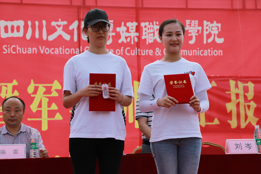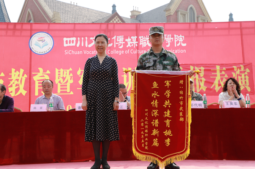 汇报表演结束后,院长助理陈雷宣布了军训团表彰通令,学院党委书记谢桂兰向绵竹市人民武装部赠送锦旗,对教官们辛勤工作表示了衷心的感谢,学院主席台领导为军训优秀辅导员和优秀学员颁发了奖状。
