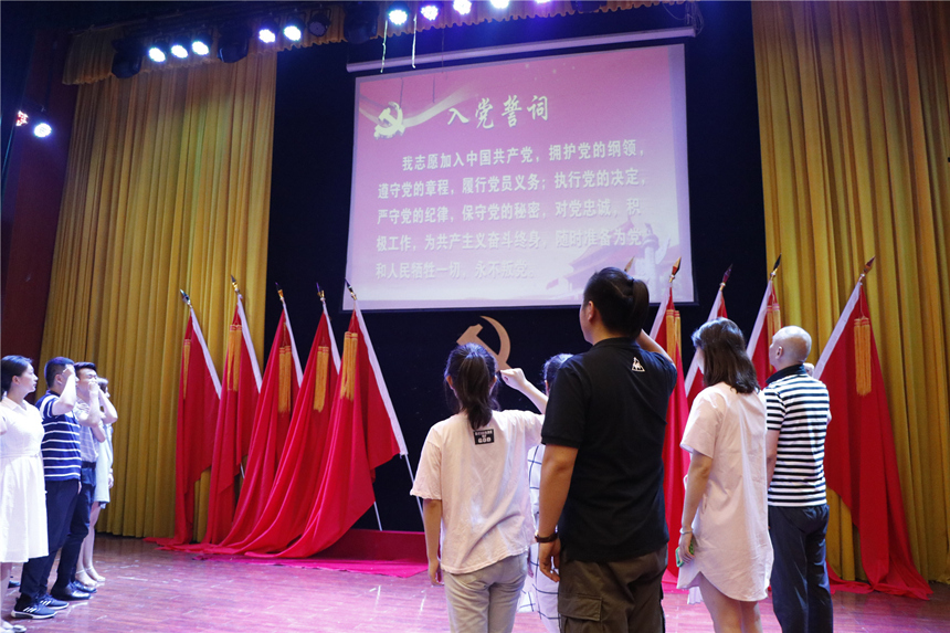 随后,本年度新发展教师党员上台与台下老党员举行宣誓,重温入党誓词。
