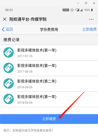 缴费成功之后,请带上身份证或手机缴费成功的界面于次日到收费室领取收费票据。