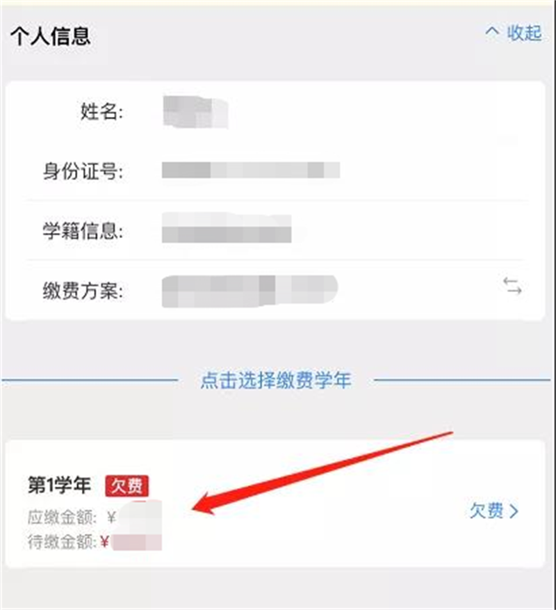 ①选择缴费年度:进入线上缴费页面后,核实缴费信息是否正确,确认缴费学年,如果有误及时联系学校。点击【第1学年】
