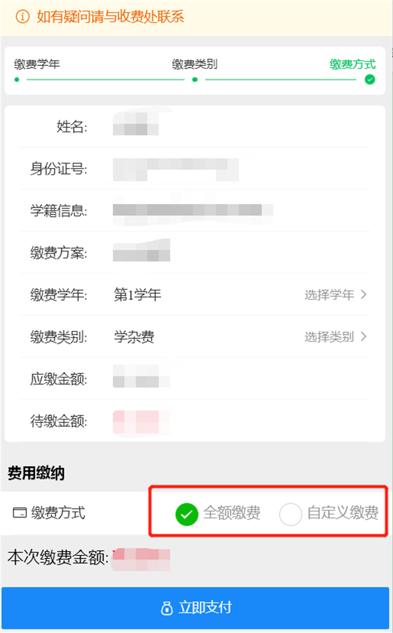 3. 进入立即缴费页面后,可通过全额缴费和自定义缴费,两种方式进行缴费