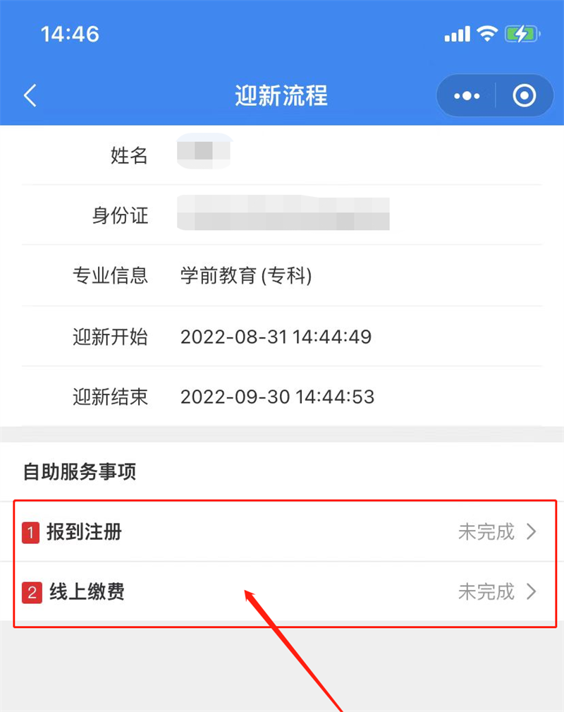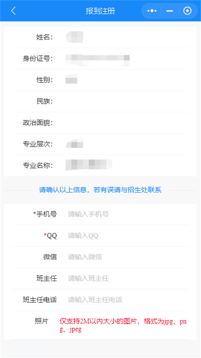 3、报到注册:学生核实自己的基本信息,包括姓名、身份证、性别、民族、政治面貌、专业层次、专业名称等。并完善手机号、QQ号、微信、班主任、班主任电话等信息。